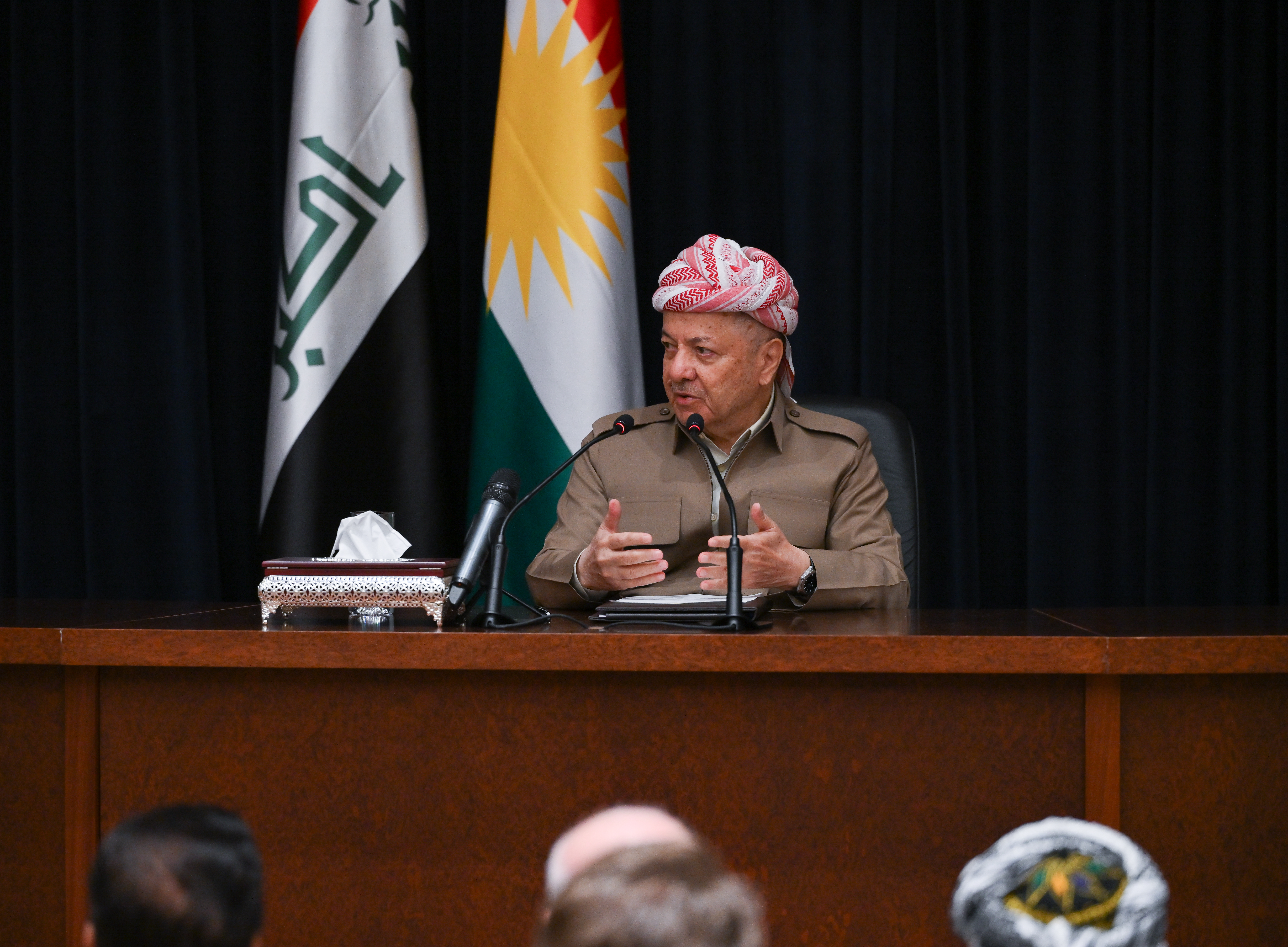 Serok Barzanî li ser proseya siyasî ya Iraq û herêmê û Herêma Kurdistanê û hilbijartinên pêşerojê yên Encumena Nûneran a Iraqê kurteyek ji amadebûyan re pêşkêş kir û behsa bingehên Destûra Daîmî ya Iraqê û nepejirandina bendên Destûrê kir ku bûn sedema derketina bi dehan pirsgirêk û astengiyan di navbera Hewlêr û Bexdayê de. Herwiha Serok Barzanî tekez kir ku bicikirina bendên Destûra Iraqê sedema sereke ya aramî, avadanî û hevjiyanê ye.